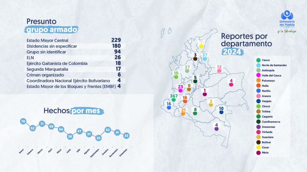 Los meses con mayor número de casos durante 2024 fueron enero (78), marzo (71), abril (59) y mayo (54). Además del Cauca, otras regiones con altos índices de reclutamiento fueron Norte de Santander (37 casos), Antioquia (27) y Valle del Cauca (23).