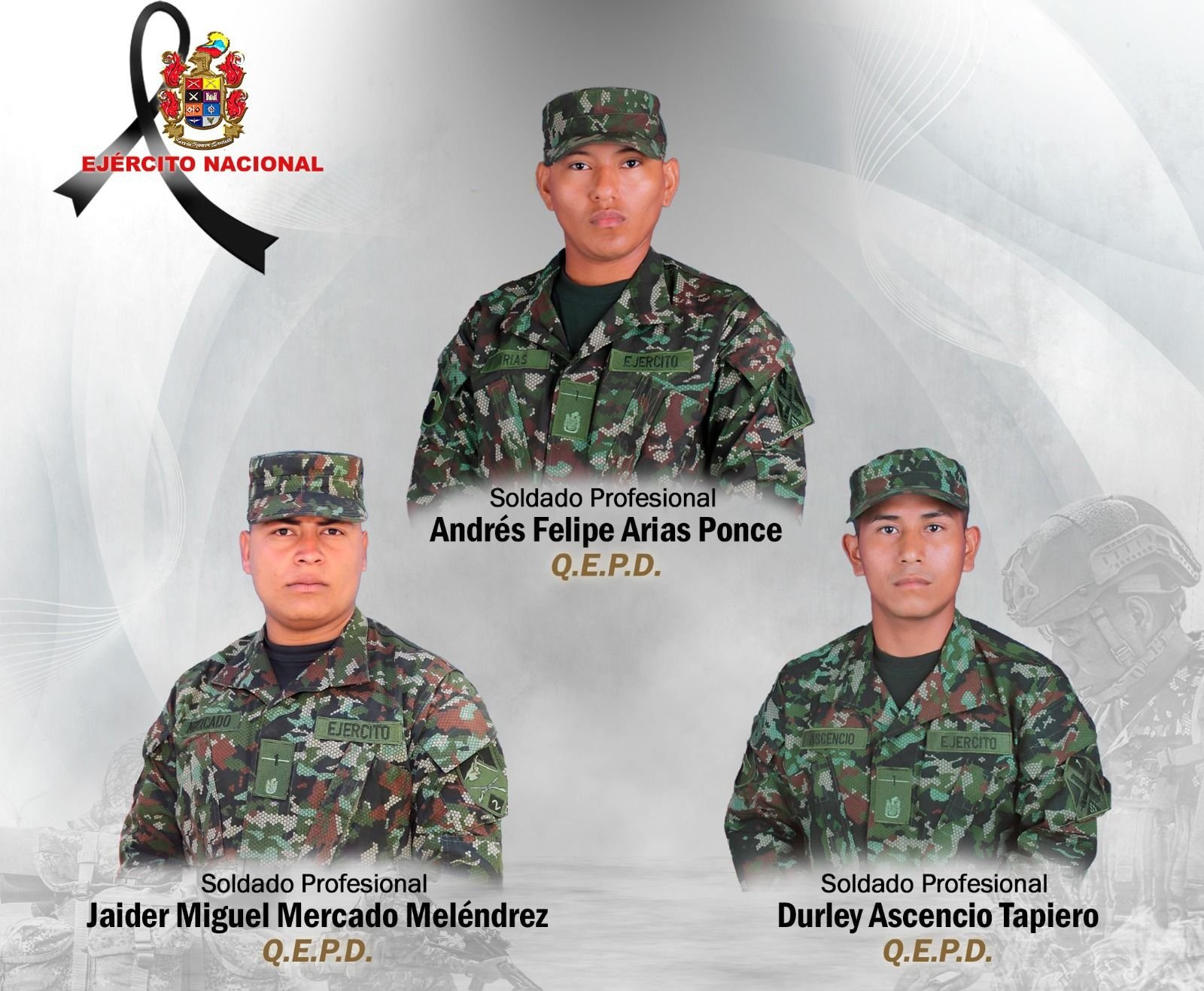 Las víctimas fatales han sido identificadas como los soldados profesionales Durley Ascencio Tapiero, Andrés Felipe Arias Ponce y Jaider Miguel Mercado Meléndrez, quienes perdieron la vida en cumplimiento de su deber constitucional.