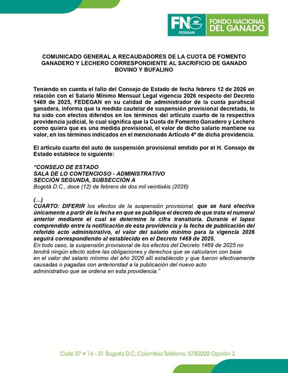 La decisión del Consejo de Estado que suspende el decreto que aumentó el salario mínimo para el 2026, no modifica la Cuota de Fomento Ganadero y Lechero que recauda Fedegán a través del Fondo Nacional del Ganado, informó Fedegán a  los recaudadores a nivel nacional.