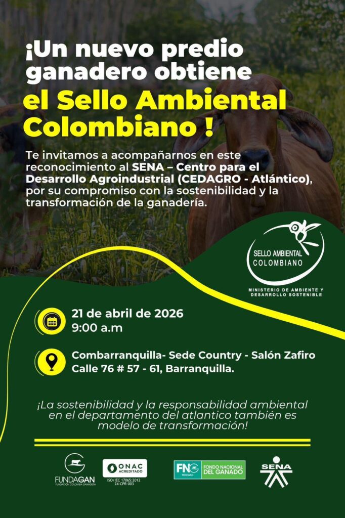 La Fundación Colombia Ganadera (Fundagán) invita a los periodistas del departamento a la entrega de la certificación con el Sello Ambiental Colombiano (SAC) al SENA – Centro para el Desarroll0 Agroindustrial (CEDAGRO – Atlántico) que será mañana martes 21 de abril a las 9:00 a. m. en Combarranquilla, Sede Country, Salón Zafiro (calle 76 # 57-61, Barranquilla).