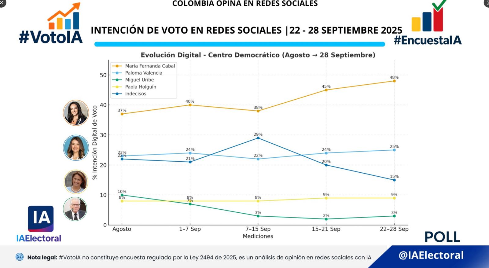 Si la tendencia se mantiene, Cabal no solo consolidará su liderazgo, sino que podría convertirse en la candidata única del Centro Democrático sin necesidad de una contienda interna desgastante. Superar el 50% sería un golpe definitivo para sus rivales y un mensaje claro de que el uribismo digital ya eligió a su abanderada.