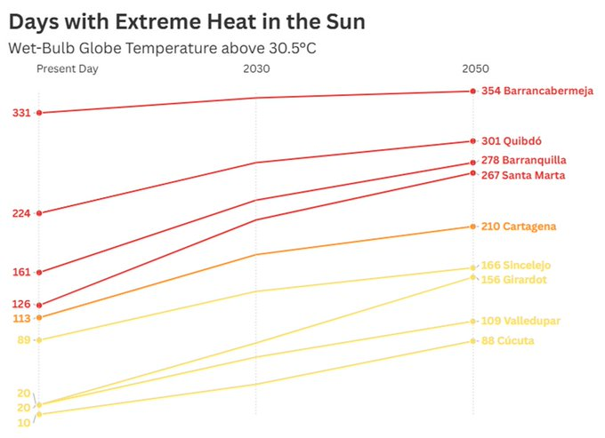 El Caribe colombiano podría vivir hasta nueve meses al año bajo condiciones de calor extremo hacia 2050, según una proyección basada en la temperatura de globo húmedo (WBGT), que combina calor, humedad y radiación solar. Ciudades como Barrancabermeja (354 días), Quibdó (301), Barranquilla (278) y Santa Marta (267) figuran entre las más afectadas.