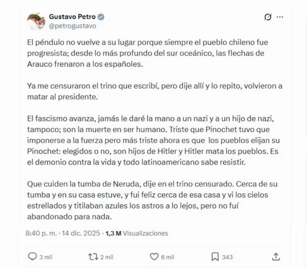 En publicaciones posteriores, Petro endureció aún más su discurso. Aseguró haber sido censurado en redes sociales y comparó la elección de Kast con episodios traumáticos de la historia chilena, como el derrocamiento de Salvador Allende. Además, reiteró sus acusaciones al vincular al presidente electo con el pasado nazi de su familia y calificó la situación como una “amenaza existencial” para América Latina.
