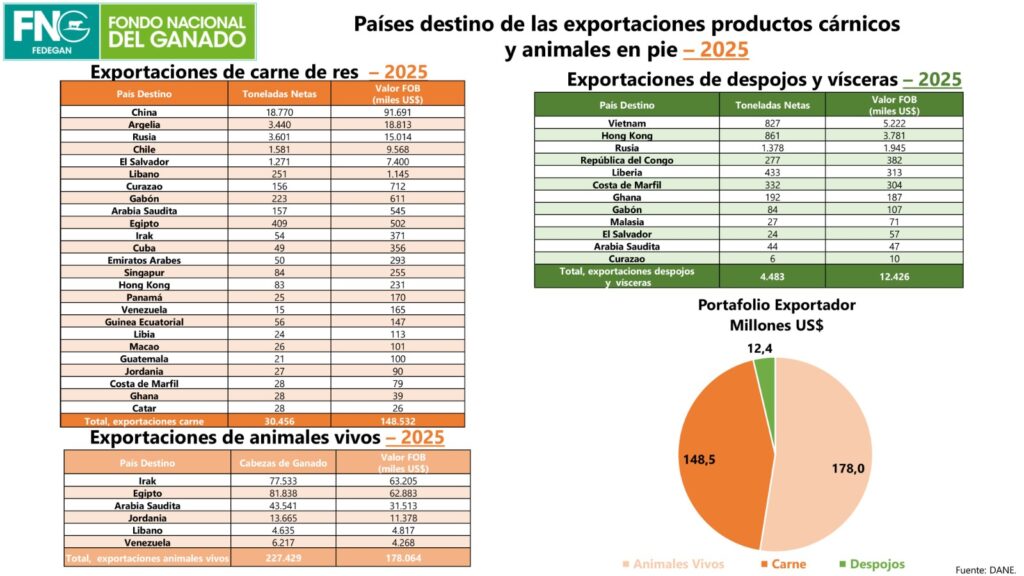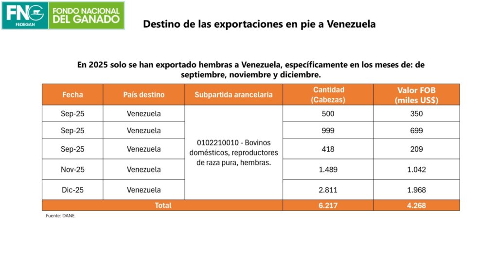 Lafaurie Rivera reveló que en 2025 se registró la exportación de 6217 hembras con destino a Venezuela por USD 4,2 millones, siendo diciembre el mes en donde más envíos se realizaron (2811 animales, USD 1,9 millones).