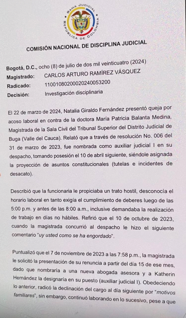 Balanta, abogada vallecaucana con experiencia como jueza, docente universitaria y magistrada de la Sala Civil del Tribunal Superior de Buga, enfrenta una investigación ante la Comisión Nacional de Disciplina Judicial. El proceso, que fue revelado recientemente, gira en torno a denuncias de acoso laboral presentadas por una exfuncionaria que habría sufrido tratos degradantes durante su paso por el despacho de la togada.