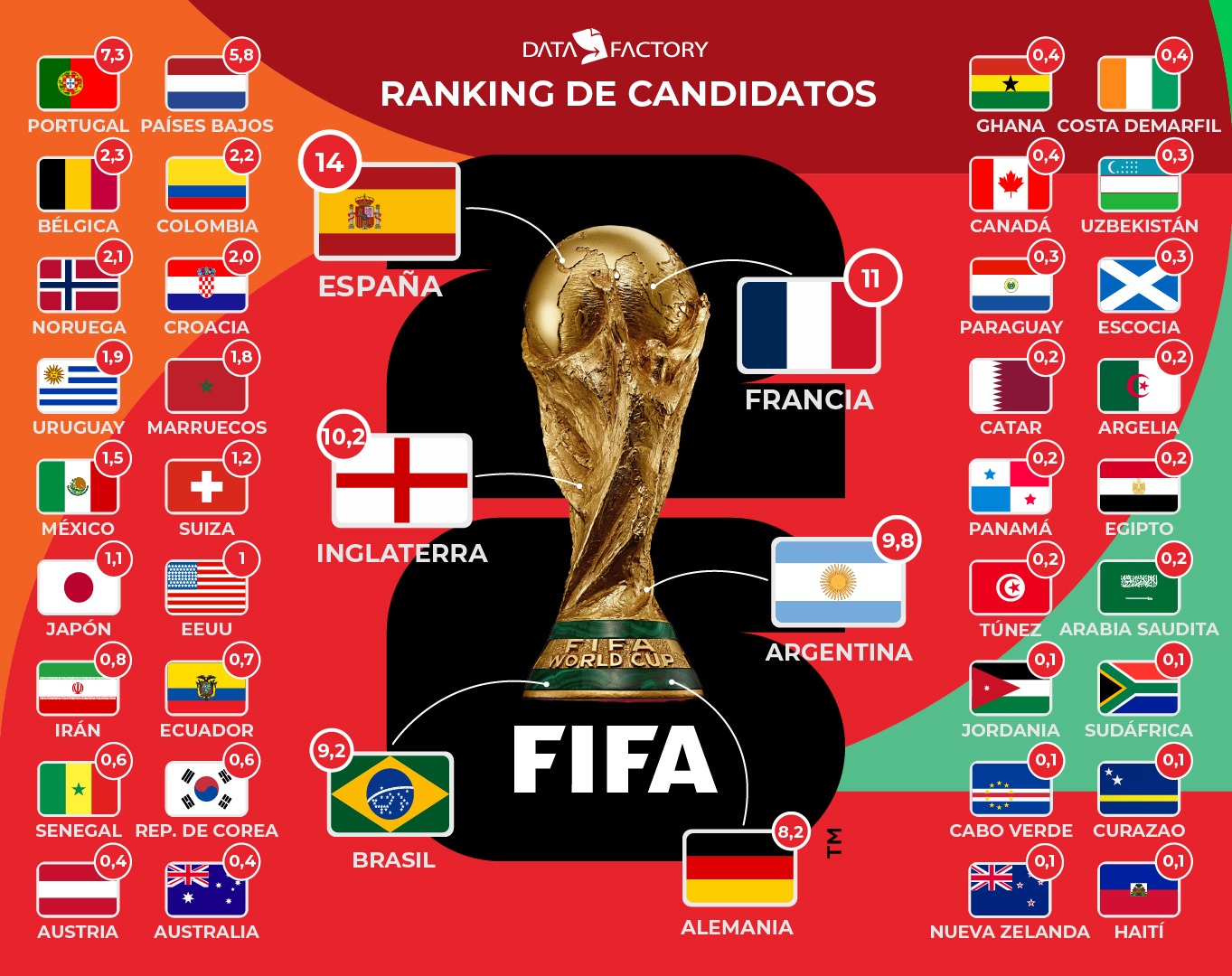 A pocos meses del inicio del Mundial de 2026, DataFactory, empresa con 25 años de trayectoria en estadísticas deportivas, publicó su ranking de probabilidades para la Copa del Mundo, ubicando a España como la selección con mayores opciones de coronarse campeona. De acuerdo con su modelo, el equipo ibérico tiene un 14 % de posibilidades de levantar el trofeo.
