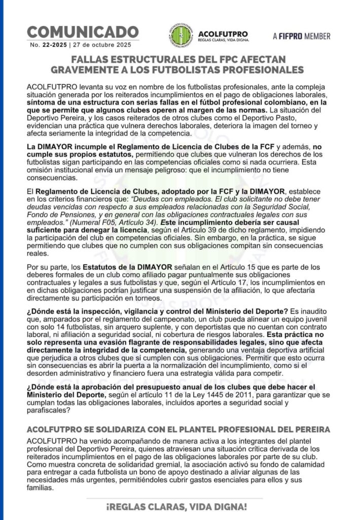 Acolfutpro recordó que el Reglamento de Licencia de Clubes de la Federación Colombiana de Fútbol (FCF) prohíbe expresamente que equipos con deudas con sus empleados participen en competencias oficiales. Sin embargo, señaló que los órganos rectores de este deporte en el país, han incumplido sus propios estatutos, al permitir que clubes como el Deportivo Pereira sigan compitiendo pese a los retrasos en los pagos y las obligaciones con los futbolistas.
