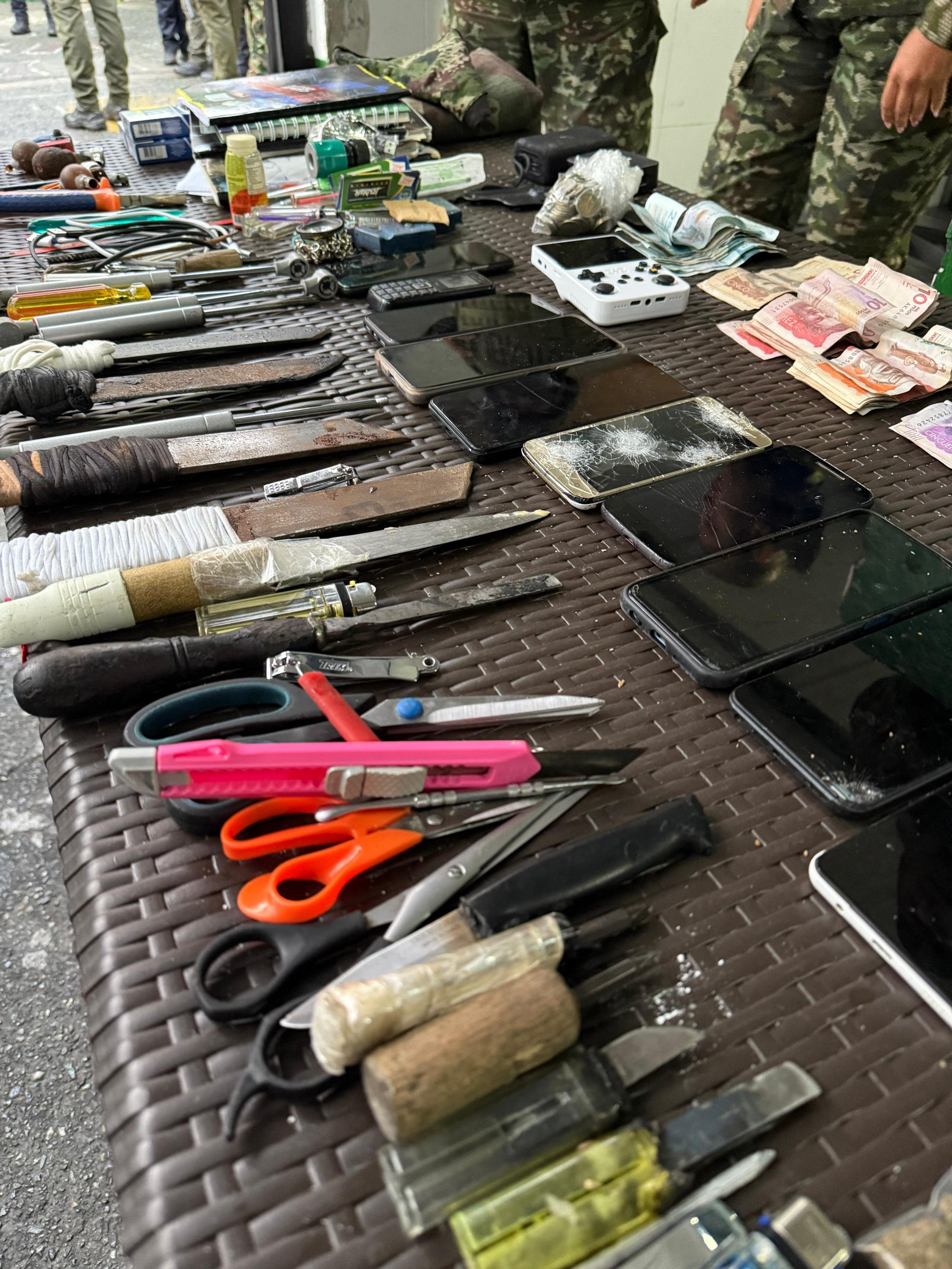 Durante la intervención, las autoridades incautaron 10 teléfonos celulares, 30 armas blancas, dinero en efectivo y 12 cuadernos con información que podría estar relacionada con extorsiones y la coordinación de actividades delictivas.