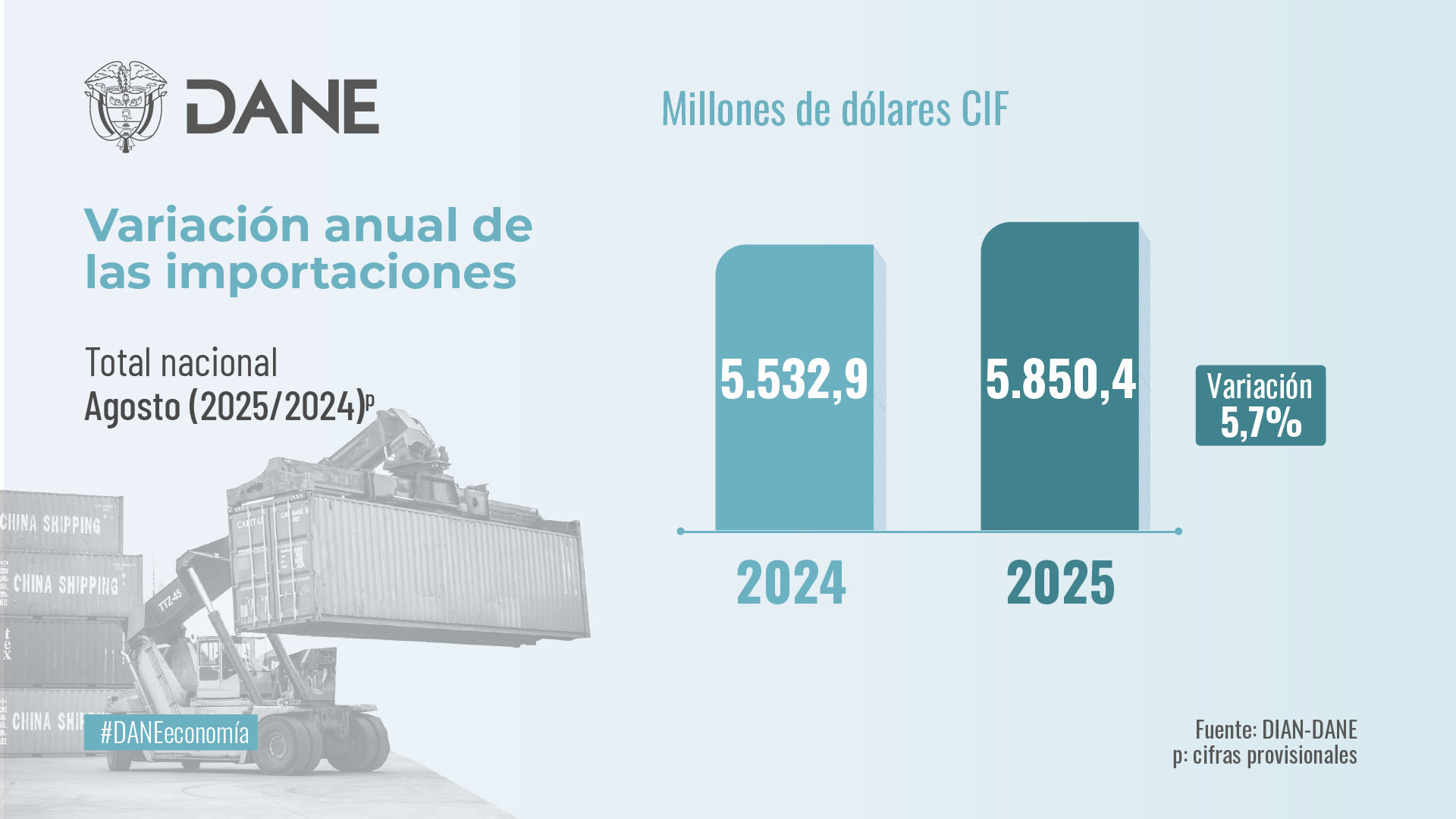 De acuerdo con cifras provisionales del DANE, las importaciones del país sumaron US$5.850,4 millones CIF, lo que representa un aumento del 5,7% frente al mismo mes de 2024.