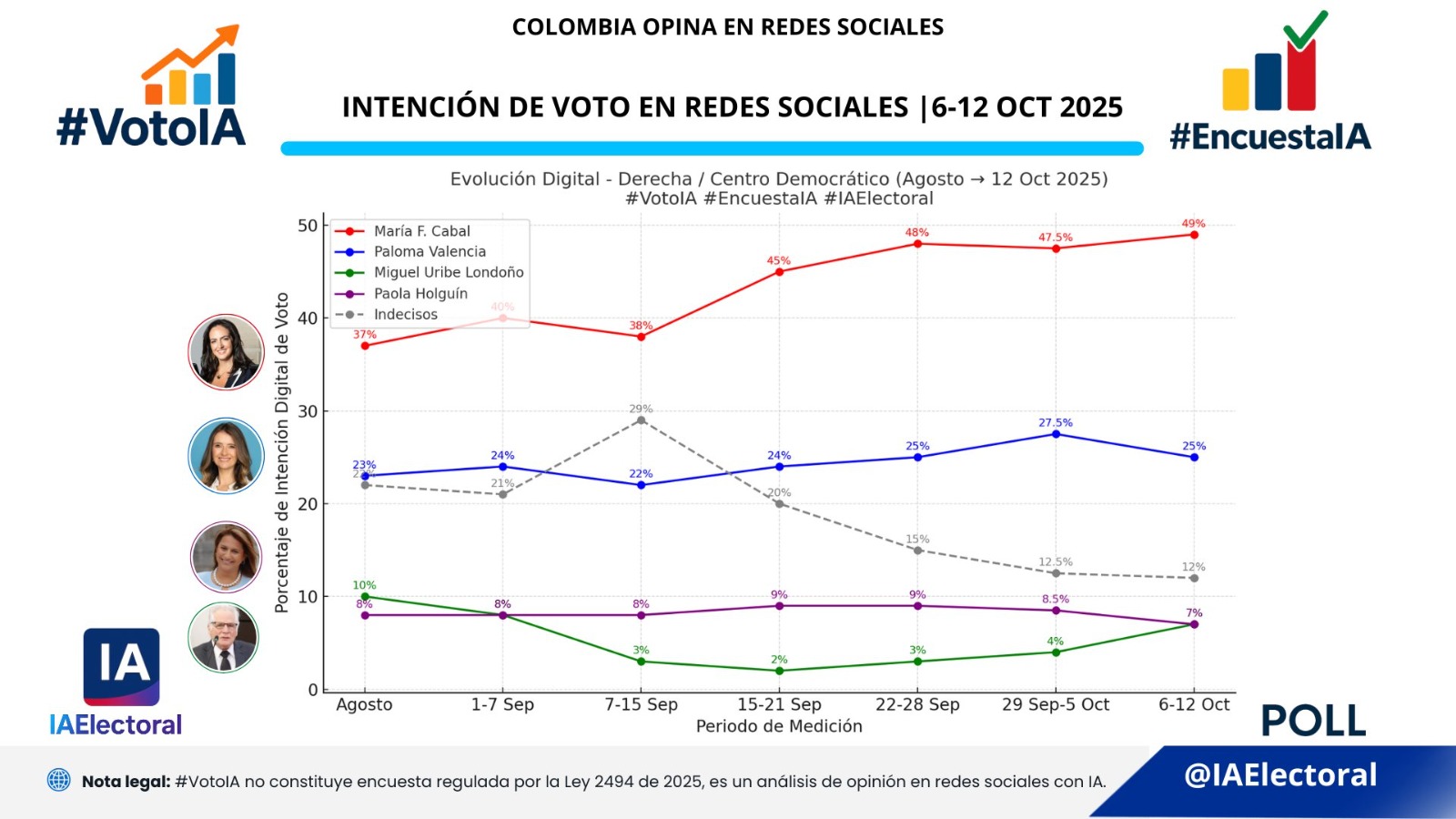 El estudio, que mide la intención de voto digital y el comportamiento político en redes sociales, muestra una tendencia clara: Cabal sube del 47,5% al 49%, mientras Paloma Valencia cae del 27,5% al 25%. Miguel Uribe Londoño duplica su marca y llega al 7%, y Paola Holguín desciende levemente al 7%. Los indecisos bajan al 12%, confirmando que este bloque es, hoy por hoy, el más consolidado del espectro político colombiano.