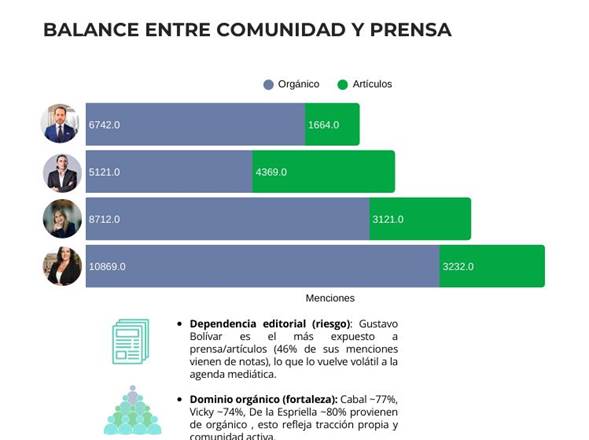 De hecho, el 77 % de sus menciones provienen de fuentes orgánicas, es decir, de ciudadanos reales, no de prensa ni de pausa publicitaria, demostrando que su influencia no depende de titulares, sino de conexión genuina con la ciudadanía.