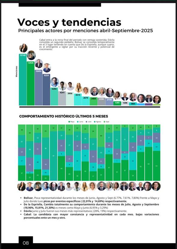 Mientras otros precandidatos experimentan altibajos drásticos como Gustavo Bolívar, cuya visibilidad depende de eventos coyunturales, o Vicky Dávila, fuerte en junio y julio, pero con caídas posteriores, Cabal es la única figura que mantiene una presencia constante mes tras mes, con bajas variaciones porcentuales en su volumen de menciones. Esto no es casualidad: es el reflejo de una comunidad digital activa, comprometida y orgánica.