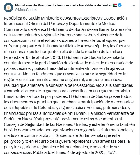 El Ministerio de Asuntos Exteriores de Sudán emitió un comunicado oficial el lunes 4 de agosto de 2025 en el que denuncia la participación de mercenarios extranjeros en el conflicto armado interno que enfrenta el país desde abril de 2023. Entre los señalados se encuentran ciudadanos colombianos, que, según el documento, estarían combatiendo junto a la llamada Milicia de Apoyo Rápido.