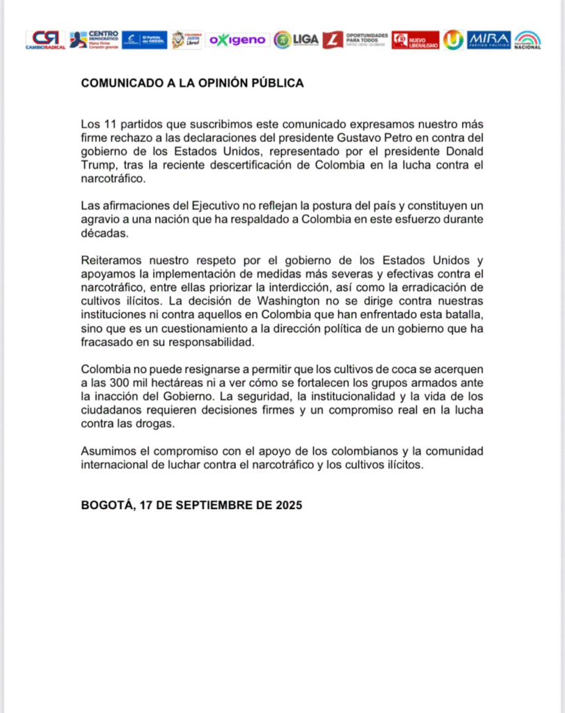 No para la polémica por la descertificación de Colombia en la licha contra el narcotráfico por parte del gobierno de Estados Unidos, uno de los aliados económicos y estratégicos más importantes del país. La mañana de este miércoles (17-09-2025) 11 partidos políticos emitieron un comunicado en el que rechazaron de manera enfática las declaraciones del presidente Gustavo Petro contra Washington.
