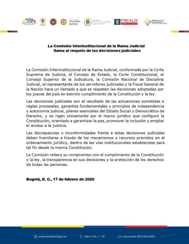 La Comisión Interinstitucional de la Rama Judicial de Colombia exhortó este martes a respetar las decisiones de los jueces y a canalizar cualquier desacuerdo mediante los mecanismos previstos por la Constitución y la ley. El pronunciamiento se produce en un contexto de tensiones entre el gobierno y la justicia tras el reciente fallo que suspendió el incremento del salario mínimo.