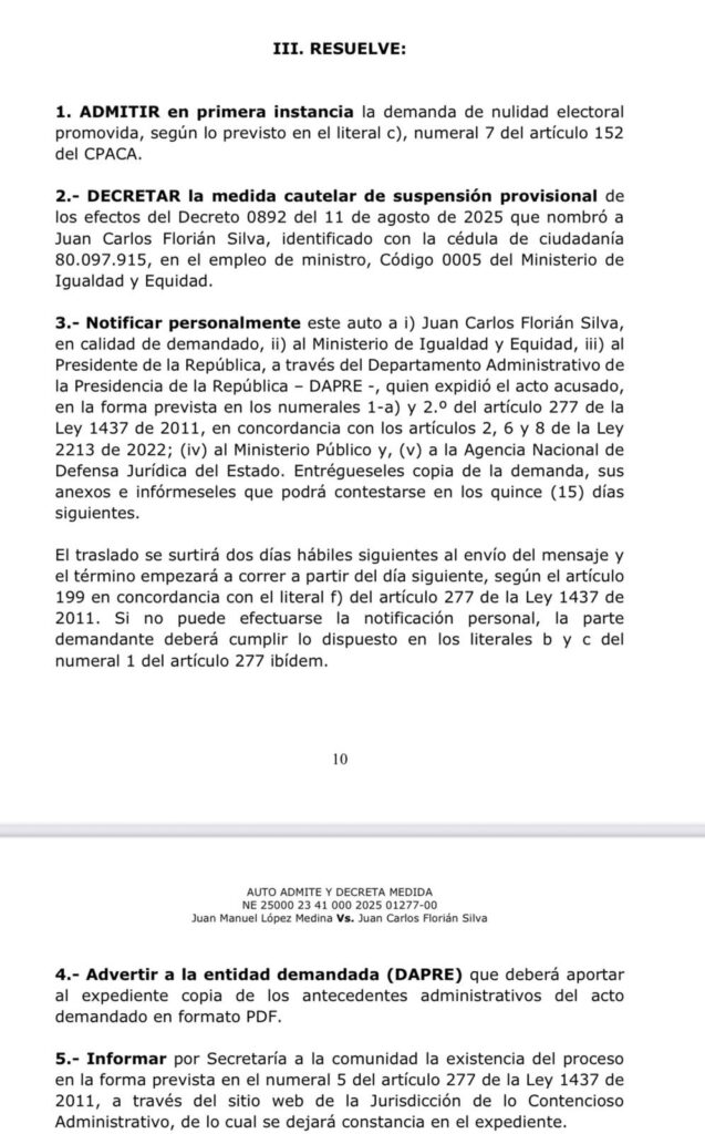 El Tribunal Administrativo de Cundinamarca ordenó la suspensión provisional del nombramiento de Juan Carlos Florián como ministro de Igualdad, tras admitir una demanda que alega que el gabinete del presidente Gustavo Petro no cumple con la paridad exigida por la Ley de Cuotas.