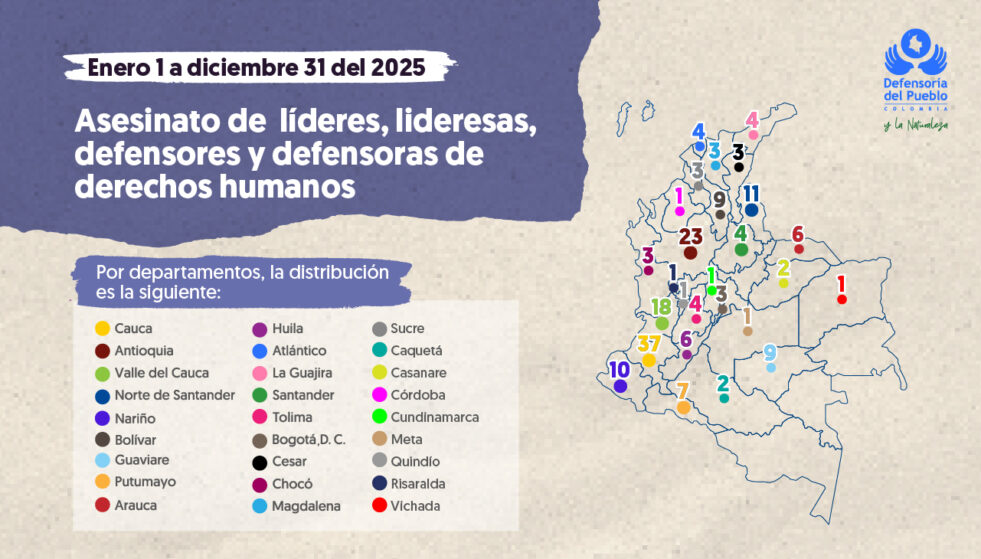 Finalmente, al entidad puntualizó que este balance anual se inscribe, además, en una tendencia de largo plazo. Desde 2016, el país acumula más de 1.600 asesinatos de líderes y defensores, una cifra que continúa poniendo en cuestión la capacidad institucional del Estado para garantizar el ejercicio del liderazgo social y la consolidación de la paz en las regiones.